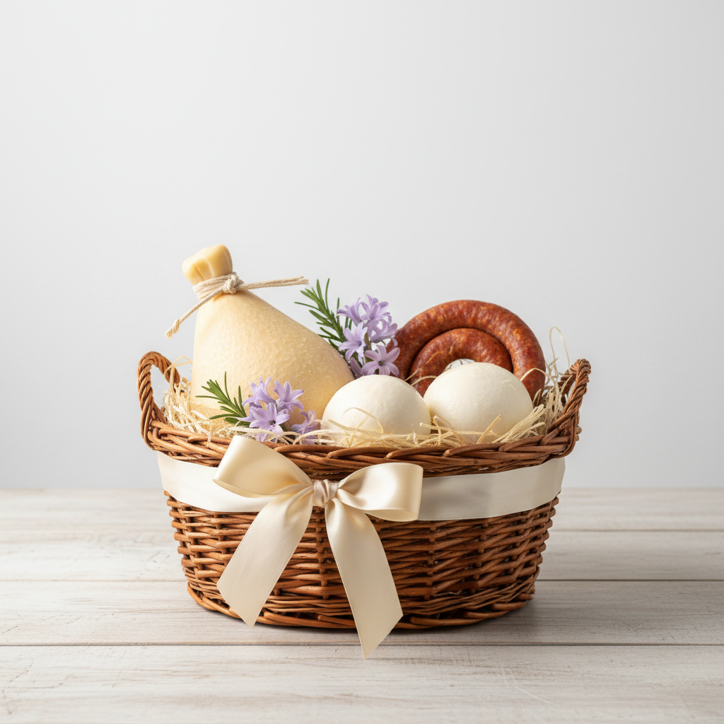 Regala il sapore autentico della tradizione con il nostro Cesto Pasquale. Una selezione curata di eccellenze casearie: salsiccia da 500 g, caciocavallo da 600 g e due scamorze da 500 g ciascuna. Tutto confezionato in un elegante cesto di cartone avvolto in pellicola trasparente, pronto per sorprendere chi ami. Perfetto per celebrare la Pasqua con un dono genuino e raffinato, direttamente dalla nostra tradizione casearia.